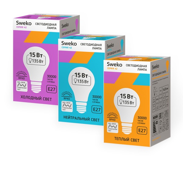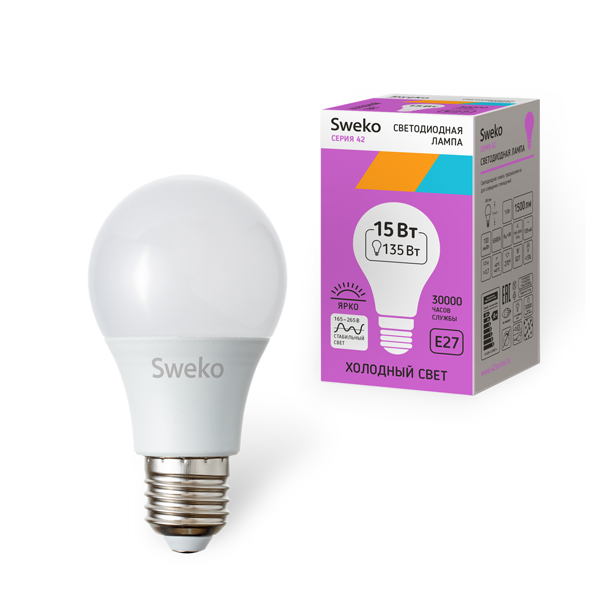 | Модель | 42LED-A60-15W-230-3000K-E27 | 42LED-A60-15W-230-4000K-E27 | 42LED-A60-15W-230-6500K-E27 |