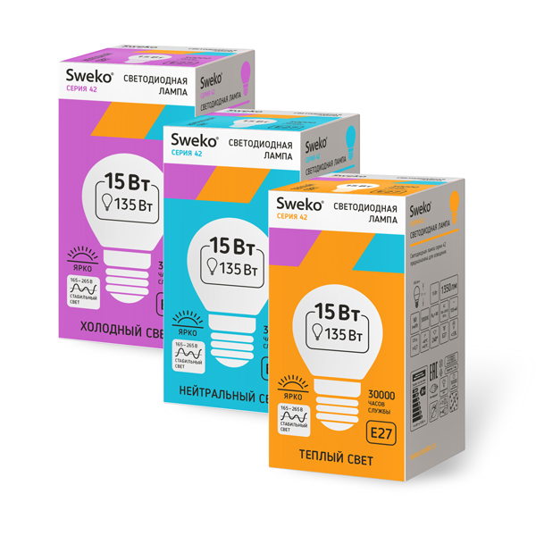 Модель | 42LED-G45-15W-230-3000K-E27 | 42LED-G45-15W-230-4000K-E27 | 42LED-G45-15W-230-6500K-E27 |